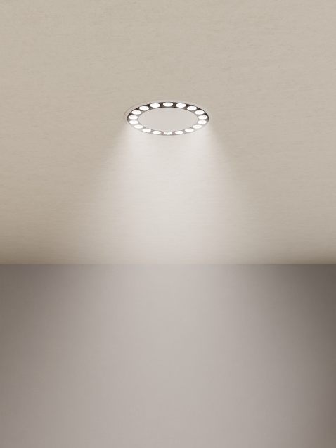 An anti-glare spotlight with 18 LED modules, which recesses fully into the ceiling for a unique look.